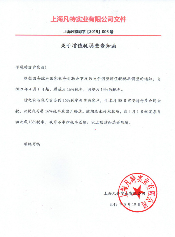 請之前與我司有合同16%稅率開票的客戶,于本月30日前安排付清合同全款,以便我司將16%稅率發(fā)票開給您。逾期或未付完款項,自4月1日起發(fā)票自動改成13%稅率,我司不承擔稅率差額。以上敬請知悉并理解。