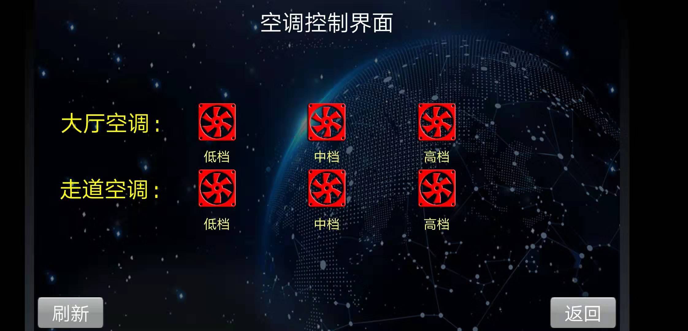 空調(diào):使用了VSU智能照明控制器自帶的互鎖功能,三個(gè)回路分別控制空調(diào)的高中低三檔,實(shí)現(xiàn)檔位的切換功能。