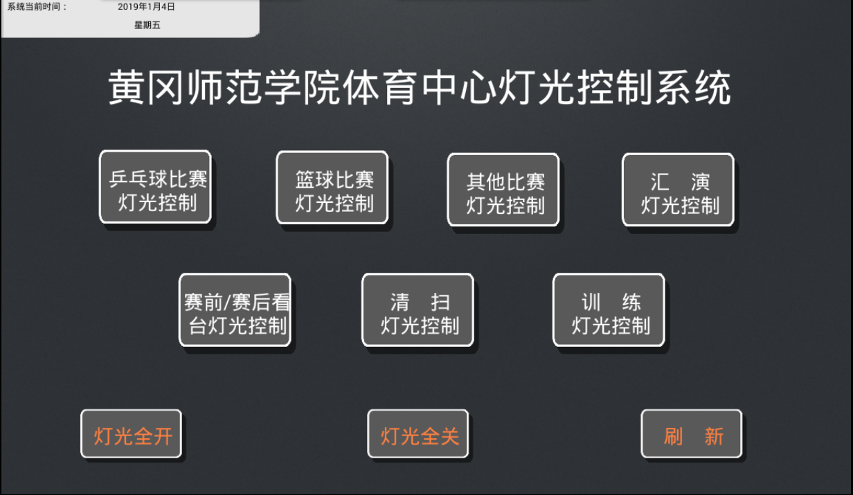 VSU為黃岡師范學(xué)院體育中心實(shí)現(xiàn)燈光智能化控制,多種燈光場(chǎng)景模式任意切換,一鍵開(kāi)閉館內(nèi)所有燈具。我司根據(jù)客戶(hù)需求設(shè)置了以下燈光場(chǎng)景模式:乒乓球比賽、籃球比賽、其他比賽、匯演、賽前/賽后、清掃、訓(xùn)練、全開(kāi)、全關(guān)。