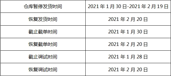 關(guān)于2021年春節(jié)期間倉庫暫停發(fā)貨及項(xiàng)目調(diào)試暫停通知