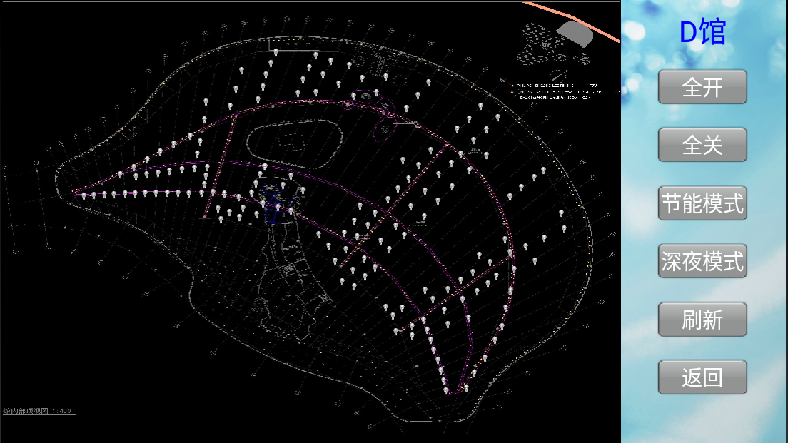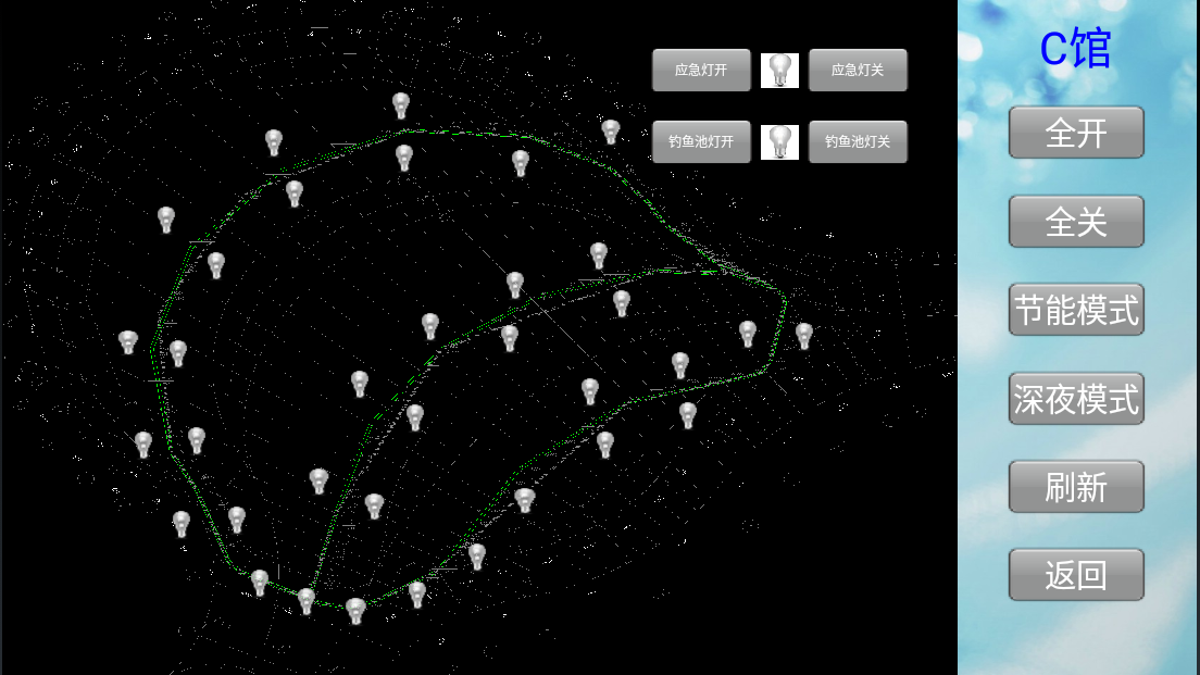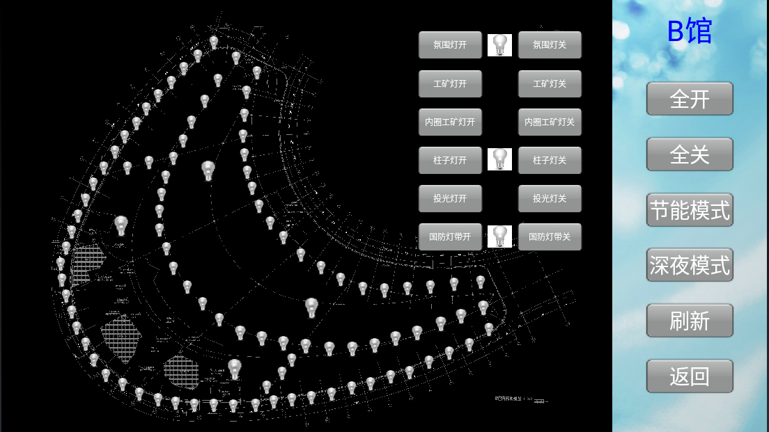 智能照明控制系統(tǒng)對各個場館內(nèi)的照明納入到統(tǒng)一的系統(tǒng)平臺進(jìn)行集中管理,實(shí)現(xiàn)一鍵全開全關(guān),游樂園可根據(jù)不同節(jié)日預(yù)設(shè)不同燈光場景,增添假日氣氛,也可根據(jù)客流量預(yù)設(shè)燈光(如下圖:節(jié)能模式),在保持照明需求以及氛圍感的同時(shí),實(shí)現(xiàn)節(jié)能減排。