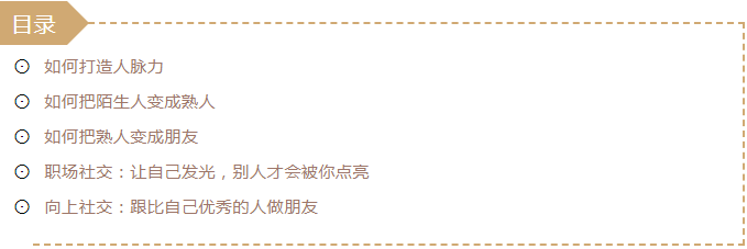 你認(rèn)識(shí)誰比你知道什么更重要,愿意為你搭橋、為你背書、助你成功這才是真正有意義的人脈。保有一顆孩童般的好奇心,對(duì)世界、對(duì)他人真正的感興趣,渴望通過人和人的交往看到更廣闊的的世界,通過對(duì)人的深入了解而認(rèn)識(shí)他們的本真。真誠、溫暖是敲門磚。把你的真誠用言語、行動(dòng),傳達(dá)給對(duì)方,讓對(duì)方感受到你的光和溫度,被你吸引。為他人創(chuàng)造價(jià)值是引路燈,做事絕不要從利己和功利的角度出發(fā),而是首先想到如何為對(duì)方創(chuàng)造價(jià)值。