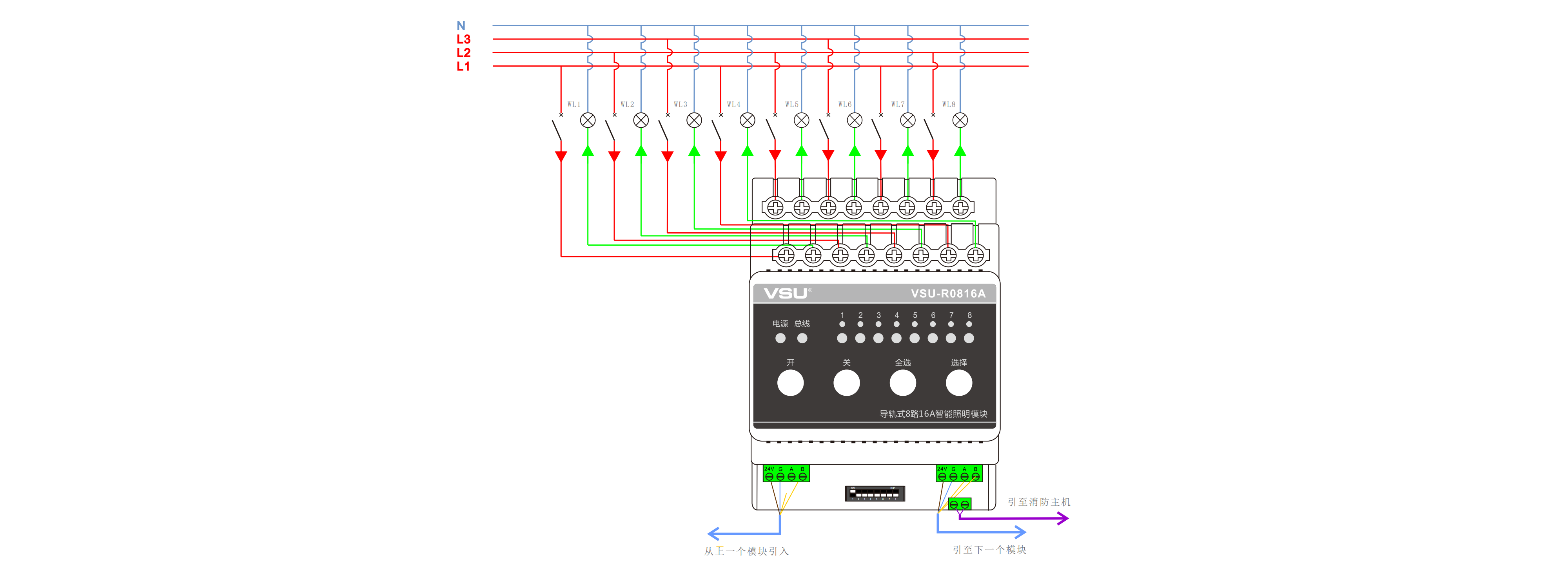 本產(chǎn)品為導(dǎo)軌式安裝,含8路智能繼電器,每回路可獨(dú)立控制3520W燈具的開關(guān),帶應(yīng)急按鍵,LED燈時時指示各個回路開關(guān)狀態(tài),可設(shè)置為互鎖控制4組窗簾開合; |